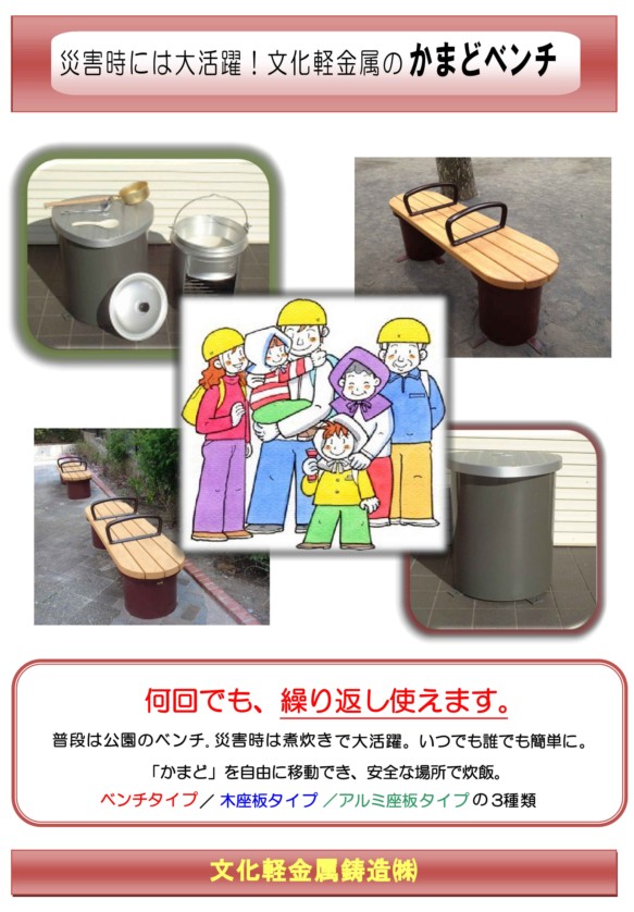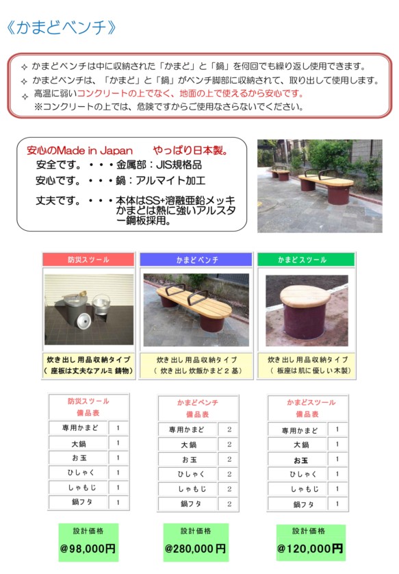 2014年度版、かまどベンチ カタログアップしました。簡単な使い方や実績記載です。どうぞよろしくお願いいたします。